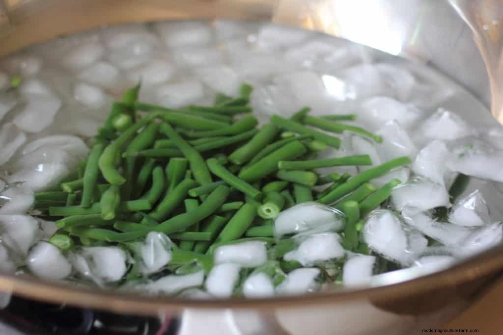 - Allow the beans to sit in the ice water for 5 minutes, or until cooled. Then drain beans and place on a clean kitchen cloth to dry a little before freezing.