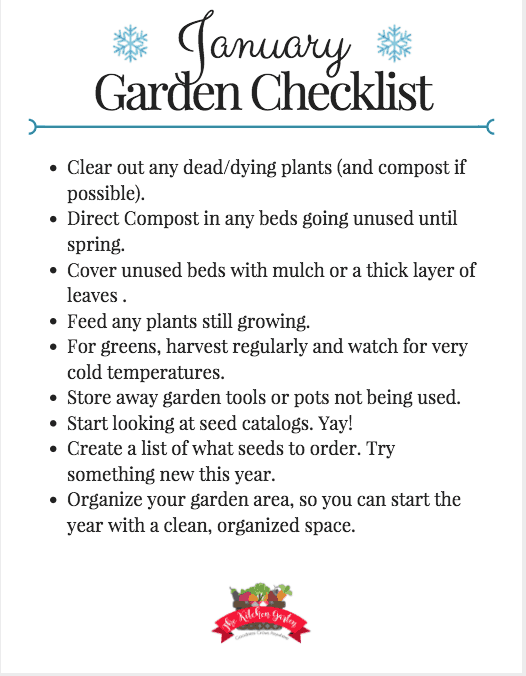 Here’s a list of garden chores to be attended to this January: (Some of these are repeats from December, since many of us still had plants growing/producing.)