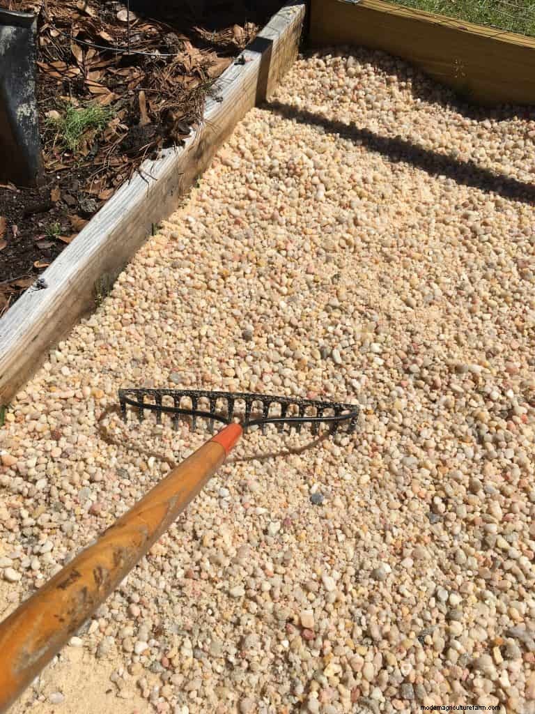If buying in bags, figure out how many bags you’ll need and then buy 3 more. It never seems to go as far as you think. Again, use your bow rake to spread out the gravel evenly. Push it into corners, and don’t skimp. You want a nice thick layer, so when you’re walking on the path you don’t step through to the sand.