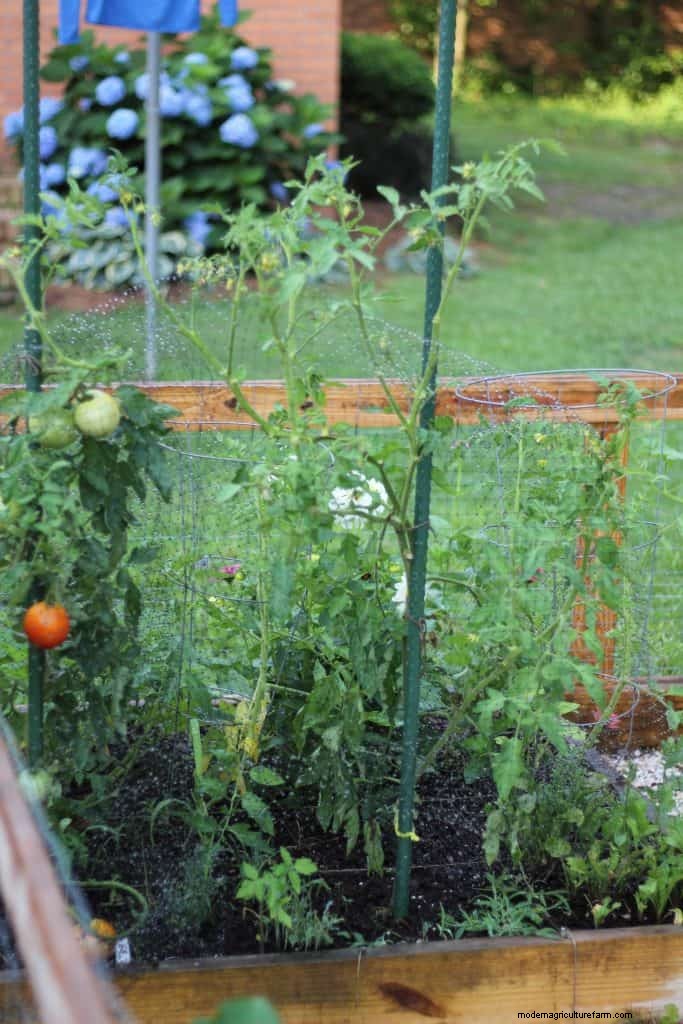Tomato plants will be healthier and stronger if they are staked and tied in an upright position. Use a wooden or metal stake that is at least three feet long (we use 8ft stakes) and drive it securely into the soil. Use one-inch strips of soft, flexible cloth to loosely tie plants to the stakes. You want to give the plants plenty of room to grow.