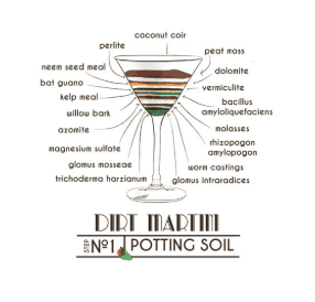 - Dirt Martini Potting Soil- This high-quality potting soil really impressed me with its list of ingredients, and if you’re new here, then I’ll say that I usually mix my own simple potting soil. But I was incredibly pleased with how the Dirt Martini felt in my fingers and by the quality products listed on the bag. Here’s the breakdown: