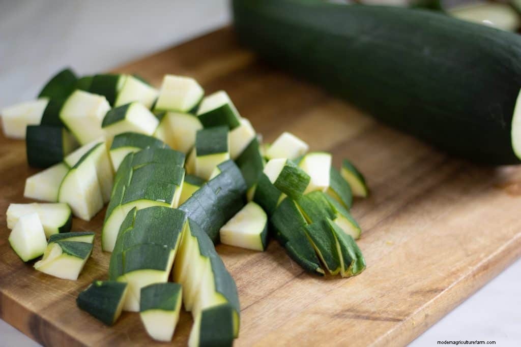 - Place a large pot of water on to boil. While water heats up, chop zucchini into small chunks.