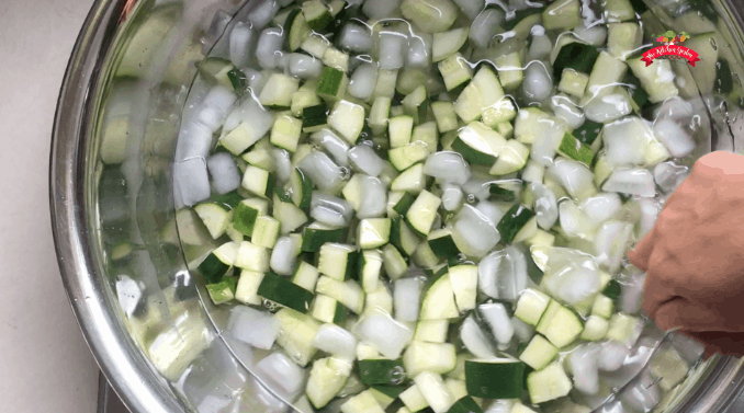 - Add zucchini to boiling water and cook for 2-3 minutes. While zucchini is boiling, place ice and water into a large bowl and set a colander in the sink.