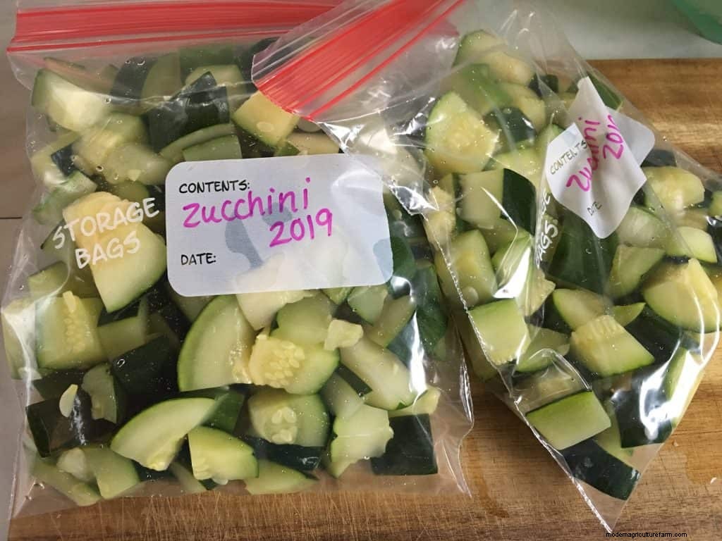 - Drain zucchini. Label quart bags with a permanent marker and begin to fill the bags with cooled zucchini.