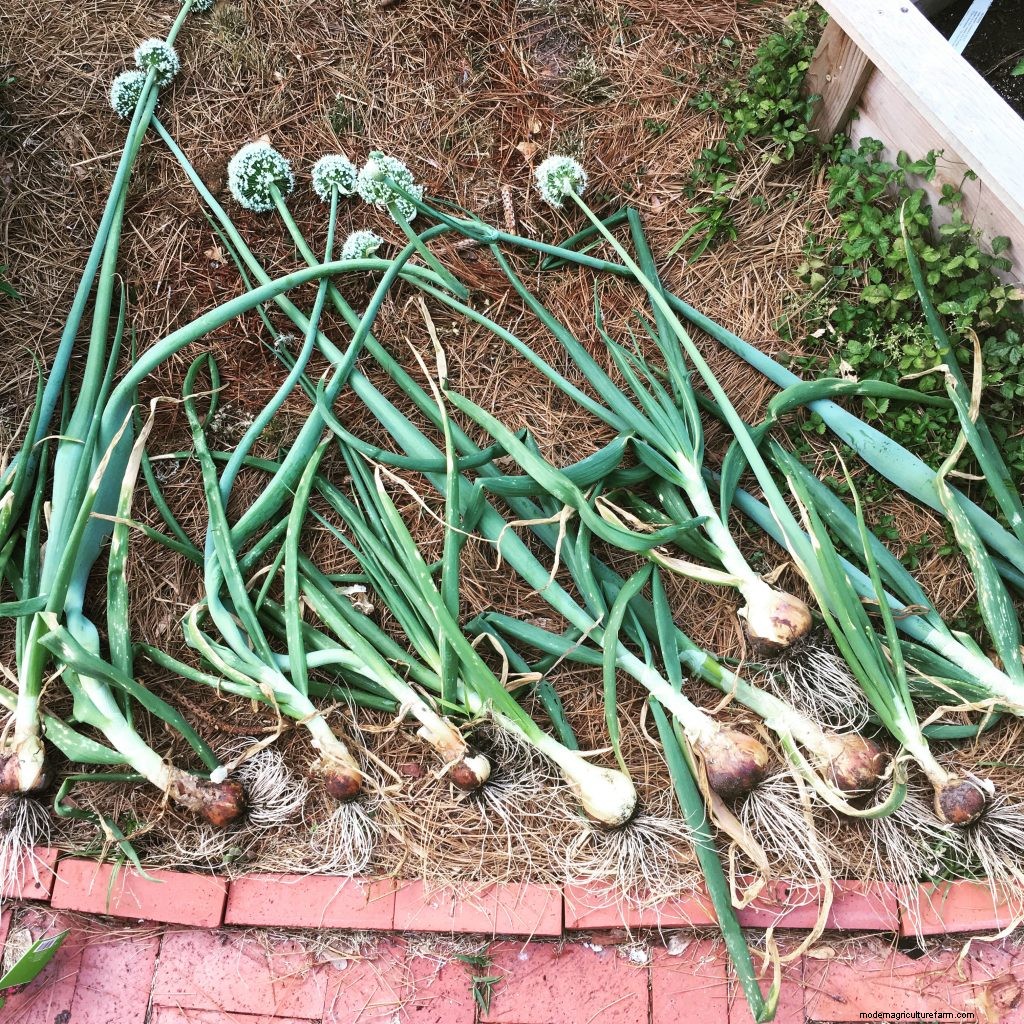 Once onions are harvested, they need to dry out for a few days, much like garlic. Lay onions out in a single layer on the ground when weather is expected to be warm and dry.