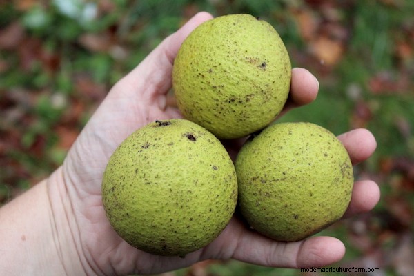 Often overlooked because the nuts have a slightly more bitter taste than English walnuts, black walnuts can be delicious if appropriately handled. It’s important to get them out of the green outer husk quickly because that husk contributes to the bitter flavor.