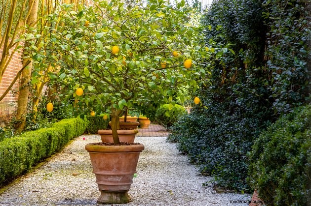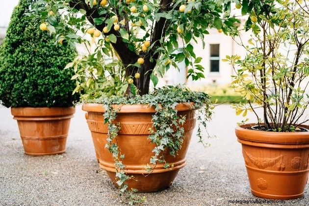 If you plant a young tree in a small pot, it will probably get root-bound, which hinders vertical growth and adversely affects fruit production. When this happens, you'll want to repot in a larger container. Even if a tree isn't root-bound, it's a good idea to repot it every two or three years to stimulate the root system. The roots can't spread freely as they would if the tree were planted in the ground, so repotting is necessary to untangle each bare root so it can draw in more nutrients. You can usually do this by scraping the root ball with your fingers or a tool, such as a hand fork. When the tree is growing vigorously, you'll want to prune it yearly in late winter to stimulate fruiting.