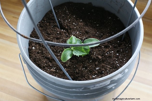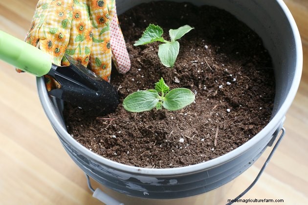 Not all cucumbers grow well in containers. Gardening radio show host Charlie Nardozzi recommends planting bush cucumbers instead of vining varieties. Possibilities include "Spacemaster" (Cucumis sativus "Spacemaster"), with a 26-inch spread, or even more compact "Bush Baby" (Cucumis sativus "Bush Baby"), with 18- to 20-inch vines. A 5-gallon plastic bucket makes an inexpensive, lightweight container with the required depth and diameter for one plant. Any cucumber container needs at least four drainage holes, and you may have to drill them yourself.
