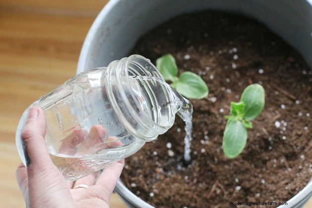 Cucumbers in containers exhaust their limited water supply quickly. Check your plant once a day in cool weather and twice or three times on hot, dry and windy days. Insert a 5-inch wooden dowel into the medium; if no medium sticks to it, don't water. If the medium is dry, water until the excess starts flowing from the drainage holes. Overly wet soil may lead to root rot, so be careful to only water when the soil is starting to become dry.