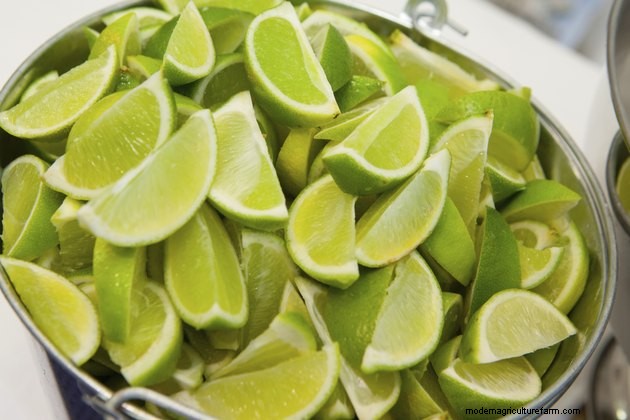 Most lime trees bloom and grow ripe fruit over a period of six to nine months. Mature lime trees drop many of their flowers and focus energy on producing only a small percentage of pollinated blooms. Lime trees grown from seeds may take up to eight years to produce fruit.