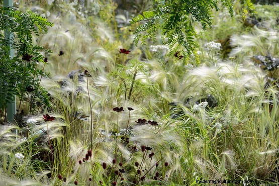 Ornamental grasses like this foxtail barley, Hordeum jubatum, have tough, flexible stems that can bend without breaking in winds. As they move, they bring a lovely, airy texture. Follow our growing advice on ornamental grasses.