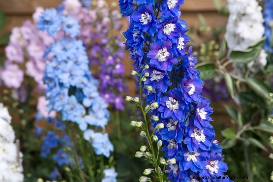 Towering delphiniums bring height and drama to herbaceous displays, and coming in shades of pink, purple, blue or white. They look fabulous with plants like phlox, shrub roses and veronicastrum.