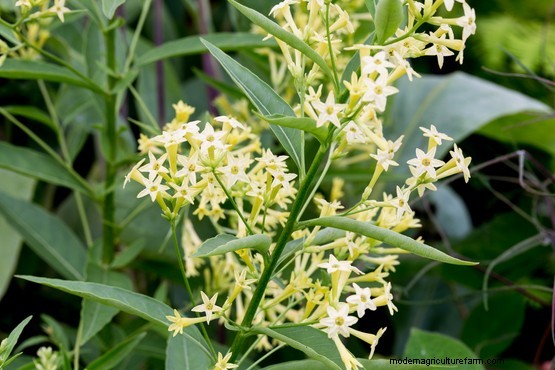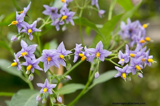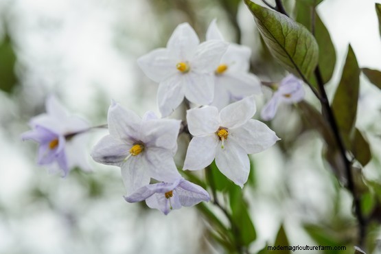 The potato vine Solanum laxum has slightly fragrant, white flowers, each with a central pointed yellow centre, from mid to late summer. Like its relative Solanum crispum, its wiry stems need tying to wires or trellis for support, but its small, semi-evergreen leaves are thinner and more delicate-looking, and it’s far less hardy. The Royal Horticultural Society has given it its prestigious Award of Garden Merit (AGM).