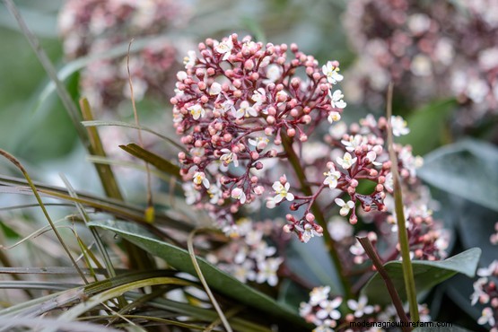 Densely packed, domed heads of deep-red buds open to tiny, cream-white flowers that – from February – give off a sweet, spicy fragrance. ‘Rubella’ is a male form, so doesn’t produce berries. Grow in partial shade in fertile, well-drained, loam-based compost.
