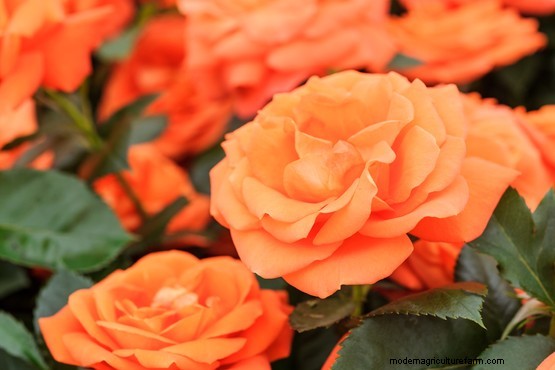 Rosa ‘Fellowship’ is a floribunda rose, bearing cup-shaped, double, orange flowers with a good fragrance. It’s an ideal choice for small gardens and containers.