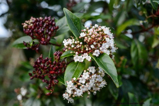 Viburnum tinus ‘Spirit’ bears pink buds that open to white flowers from October to March, followed by blue berries that turn black.