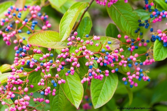 Viburnum nudum has greenish-white summer flowers, which are followed by pink berries that mature to a deep bluish-purple.