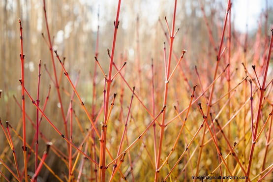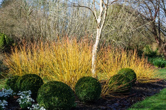 Cornus sanguinea, Cornus alba, Cornus stolonifera and Cornus sibirica must be cut hard back in March to encourage colourful stems.