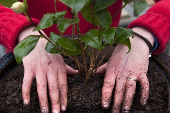 Before you start, water the camellia thoroughly (ideally with rainwater) in its original pot. Ensure the roots are fully saturated and allow to drain. Move your intended pot to its final position before planting it up as it may become heavy.