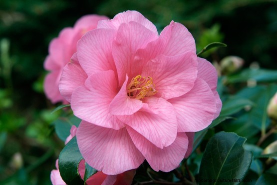 - Camellia x williamsii ‘Contribution’ – has semi double pink flowers with bright yellow stamens. The x williamsii hybrids are the toughest and easiest camellias to grow