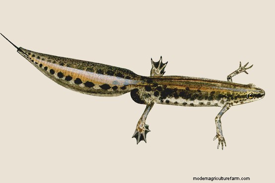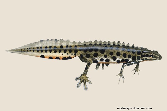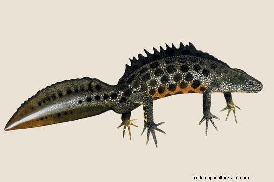 The great crested newt has a slim, dark olive or slate-black, slightly warty body, reaching 11-17cm, including tail. The underside of the male has fiery orange, yellow and black marks, with a high, ragged crest along the body and tail.