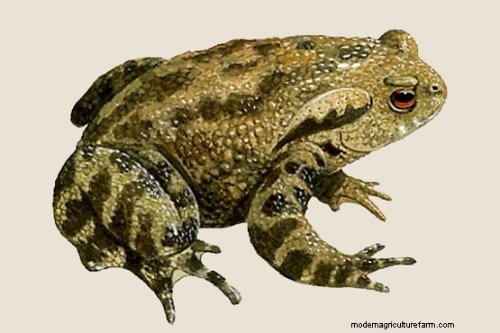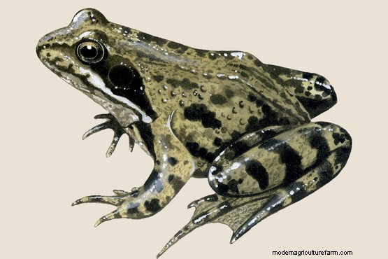 The common frog has a smooth-skinned greenish, brownish or yellowish body, 6-9cm long, often marked, marbled or streaked. It has long legs for hopping. It lays over 1,000 eggs in a gelatinous spawn mass.