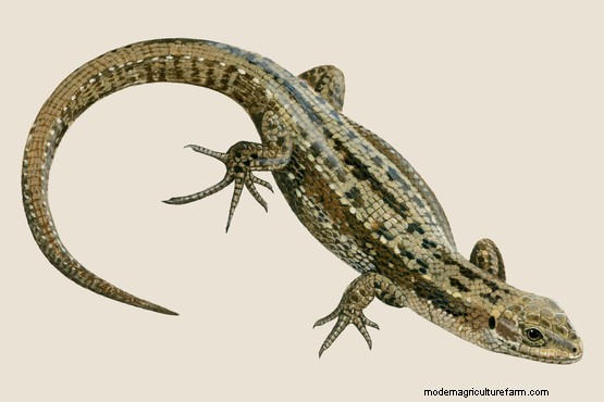 Slim and short-legged, the lizard’s mottled brown or yellow body, with orange, red or yellow tinges, can reach 16cm, including its tail. The male has a spotted or striped belly. It lives in rough, grassy places and basks on logs or rocks. Eats insects, spiders, worms and slugs.