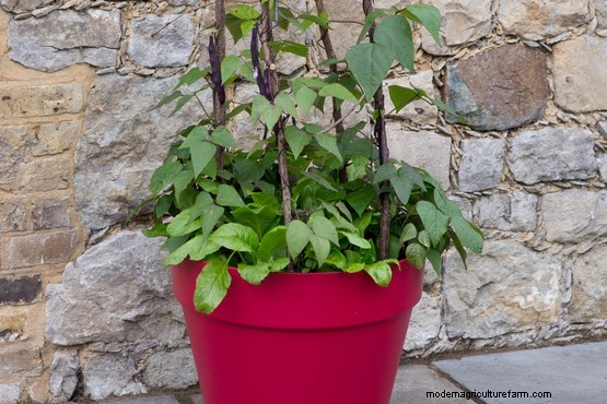 You will need: Six climbing French bean plants ‘Cosse Violette’ grown from seed, perpetual spinach seeds, multi-purpose peat-free compost, six hazel sticks (1-1.5m long), large plastic pot (approx. 50cm wide x 45cm high), liquid seaweed feed.