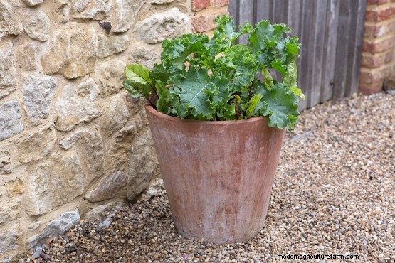 Then sow a few kale seeds into a modular tray. When the kale seedlings are 10cm tall, transplant the strongest one into the large pot. Water regularly and watch out for slugs, snails and caterpillars. After two weeks, feed with liquid seaweed fortnightly.