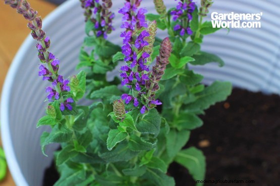 ‘Ostfriesland’ is a hardy, compact salvia, so it’s well-suited to growing in pots and containers. The flower spikes bear lots of vibrant violet flowers along their length and are a magnet for butterflies and bees. Other salvias to consider include Salvia ‘Flower Child’ and Salvia ‘Viola Klose’.