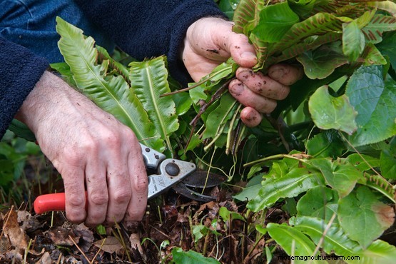 Ferns require very little care. Remove any dead or damaged fronds in May from evergreen ferns. The fronds of deciduous ferns can be cut back in autumn. Mulch annually in autumn or spring with home-made leaf mould.