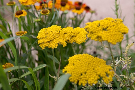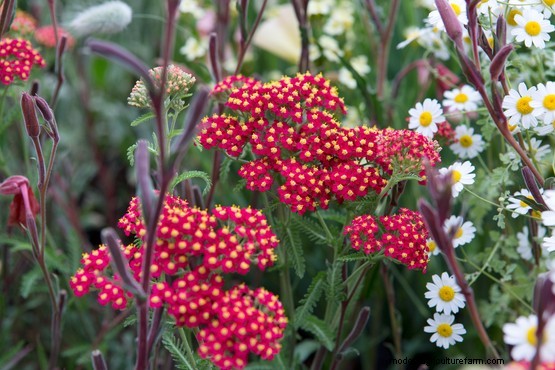 ‘The Beacon’ is a bi-coloured achillea with deep red flowers with yellow centres. Here, it’s growing alongside a froth of silver tansies (Tanacetum niveum).