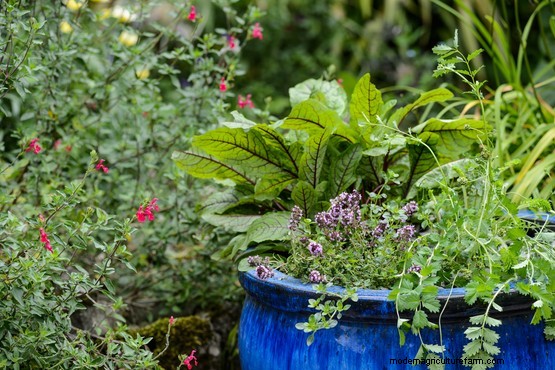 These herbs suffer in wet soils so mix one handful of grit for every two of compost when planting, so water drains through freely. Water just once or twice a week (more often in very dry spells). Trim stems back by a third after they finish flowering to keep them compact. After a few years, the rosemary and sage will outgrow the pot – simply plant them out in the garden. Take cuttings to grow new young plants in pots.