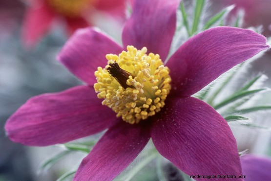 Pasque flower, Pulsatilla vulgaris, bears light purple, cup-shaped flowers which mature to develop a star shape, above ferny foliage. Grow in well-drained soil in full sun.