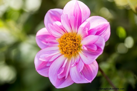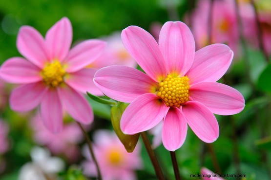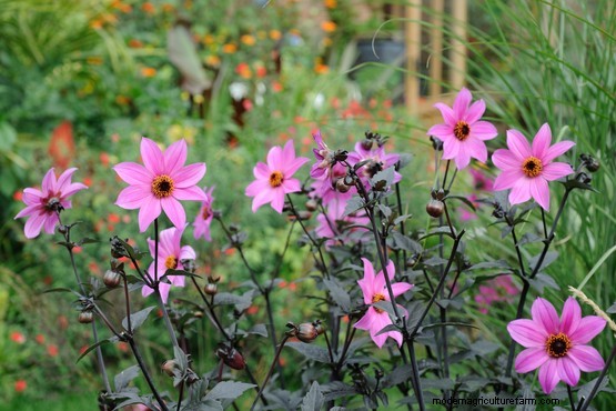 Topmix dahlias are all low-growing, single-flowered floriferous and bushy plants. Due to their low-growing habit, Topmix dahlias are ideal for growing in pots on the patio, and at the front of the border. They don’t need staking. Dahlia ‘Topmix Pink’ bears pretty, single pink flowers with yellow centres, in contrast with dark green foliage. Its pollinator-friendly flowers last throughout summer and well into autumn.