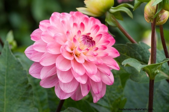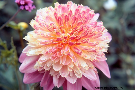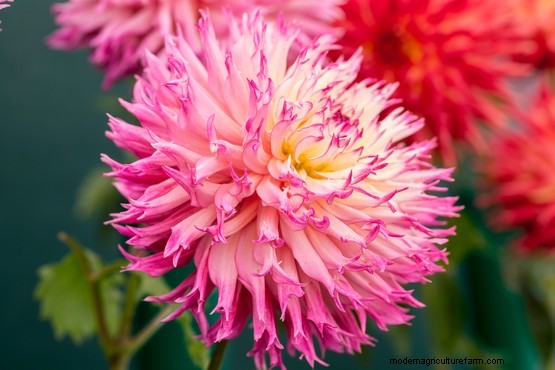 Fimbriated dahlias have fully double flowerheads, with each petal split at the ends. Fimbriation is found in most of the dahlia groups but is most common in the cactus and semi-cactus varieties. Dahlia ‘Nenekazi’ is a dramatic looking dahlia, bearing delicate pink florets fading to cream yellow at the centre. It works well in a variety of planting schemes and makes an excellent cut flower.