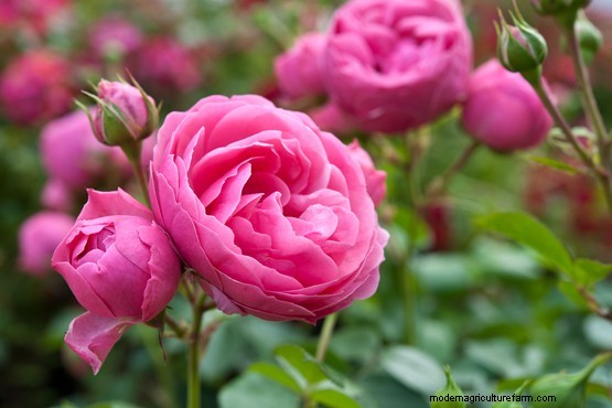 ‘Pomponella’ is a compact floribunda rose, with bushy, dark-green foliage. Throughout summer, it bears clusters of small, dark pink, old-fashioned rose flowers with a delicate fragrance. It’s ideal for growing towards the front of a sunny ornamental border, or in a pot on the patio.