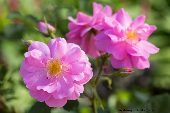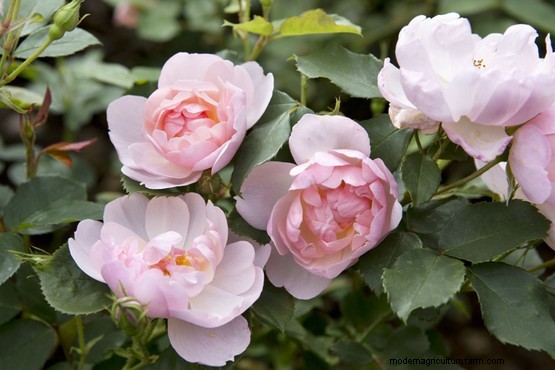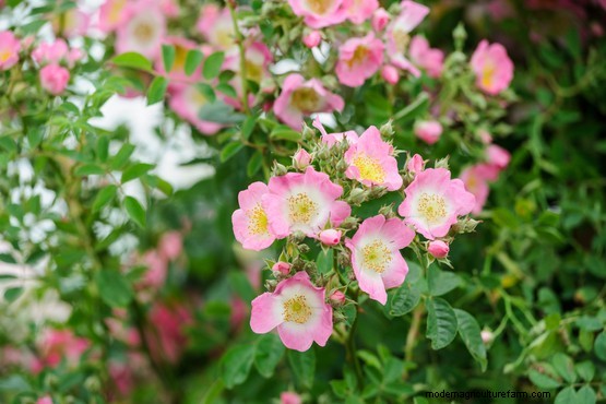 This bushy English shrub rose bears sprays of soft pink, semi-double flowers with golden-yellow stamens and a musky ‘old rose’ scent. It’s suitable for a mixed ornamental border and can also be grown in a pot. Its semi-double flowers are attractive to bees, and it forms hips in autumn, making it a good choice for birds.