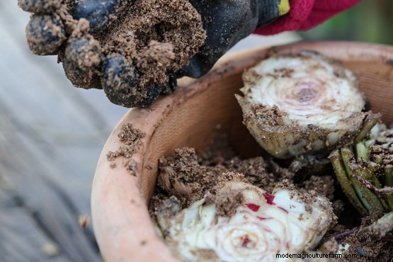 For forcing varieties, you will need to lift the roots in November, throwing away the smaller ones. Cut back leaves to 2.5cm and pack the roots horizontally in sand. Store them in a cool shed until needed. To produce chicons, plant a few roots in medium-sized pot of moist compost, with the tops just above the soil. Cover with either a black polythene bag or another pot and keep at 10-15°C (50-59°F).