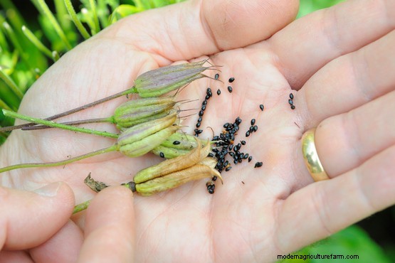 Aquilegias will self-seed prolifically and cross-fertilise. You may end up with some unique variations in your own garden if you leave the plants to their own devices. Alternatively collect the seed by waiting till the pods have dried a little on the stem. Then cover with a paper bag and shake the dried seedheads to release the very tiny seeds.