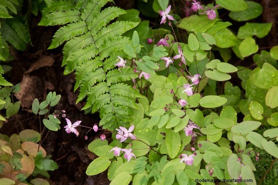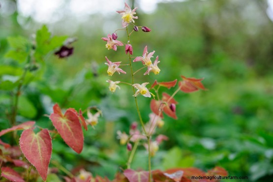 - Epimedium ‘Pink Champagne’ – a hybrid cultivar, with attractive bronze-red foliage and pink-red hanging flowers