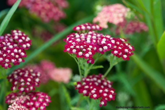 Achillea millefolium ‘Cerise Queen’ – one of the pink varieties. The cerise flower heads have dark margins and paler colouring towards the centre.