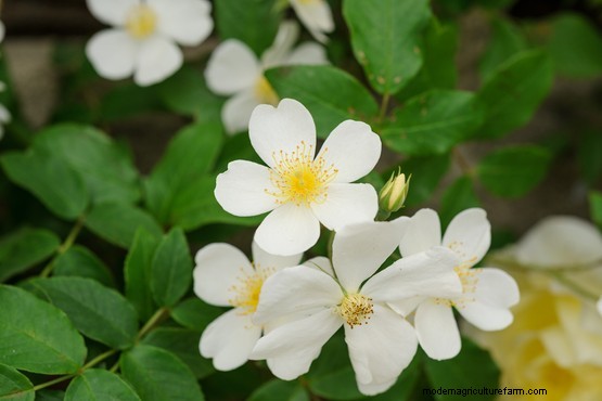- Rosa ‘Sanders White’ – fragrant semi-double white flowers in July. Stems are quite thorny. Reaches a height and spread of 3.5m