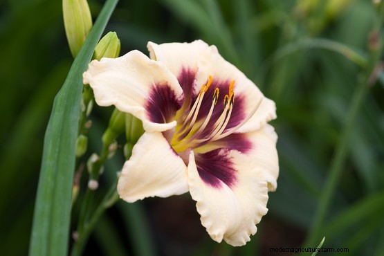 ‘Piano Man’ has fragrant cream flowers with a plum eye and green throat. A particularly floriferous variety, it has masses of elegant blooms for weeks on end. In milder regions its strap-like foliage is evergreen, which is excellent for hiding unsightly spring bulbs after they’ve flowered.