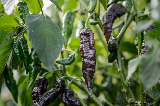 Bangladeshi variety ‘Black Naga’ bears large, thick-skinned chillies that need a long, hot summer to darken to full super-hot punch – occasionally hitting one million Scoville Heat Units. Cooking brings out a fruity flavour.