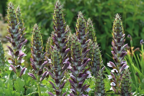 - Acanthus mollis – grown for its bold, glossy, architectural leaves and attractive white, purple-hooded flowers in late summer