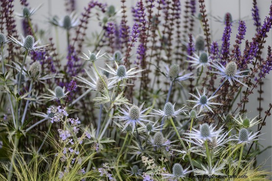This striking combination makes the most of feathery ornamental grass Stipa tenuissima, which brings out the contrasting spiky, silvery blue eryngium flowerheads. These are further complemented by the backdrop of dark purple Salvia nemorosa ‘Caradonna’. Easy to grow and long-lasting, this would work in a low-maintenance border or prairie scheme.