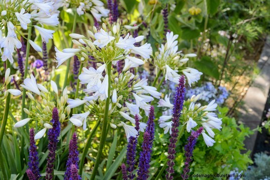 In this contrasting colour combination, Salvia nemorosa brings out the icy white-blue of the agapanthus flowers. It’s the perfect partnership for a sun-baked patio and would work well as a container display.