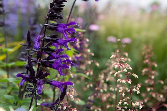 This arresting combination contrasts the sumptuous, velvety purple flowers of Salvia ‘Amistad’ with delicate, simple pink heuchera flowers. Both the colour and form of each flower enhance the beauty of the other.