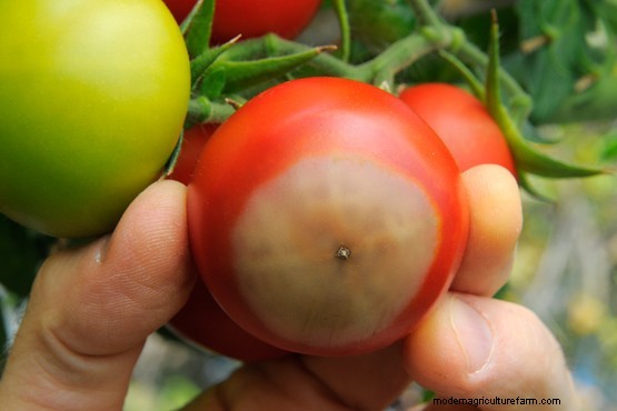 A rotten spot at the blossom end of tomatoes, aubergines and peppers, caused by lack of calcium, often as a result of irregular watering.